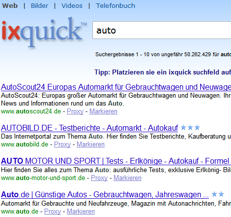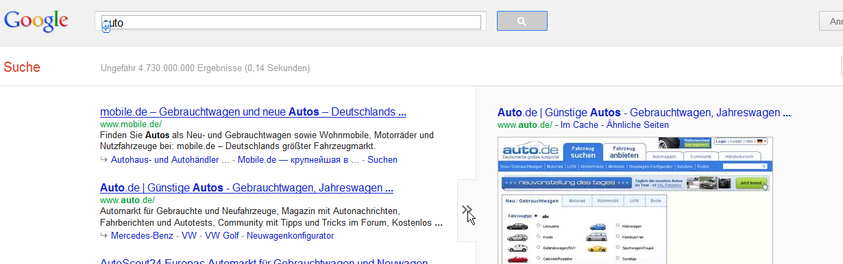 3.) Google Platz 1 .... ja das ist so etwas .... man sucht ... auto ... konkret und immer wieder .... ist als keyword so bei meiner site hinterlegt - also bei jeder Suche nach auto ... kommt der Hinweis: http://www.auto.de ... an vierter Stelle nach den drei Werbeeinträgen... jedesmal bei jeder "Auto"suche .... so habe ich es eingerichtet ... ich bin ein cleveres Bürschchen ... auf Google Platz 1 geschafft - seit Jahr und Tag ... ist einleuchtend oder ??? - Das kann und darf über Firefox nicht anders sein ... und trotzdem find ich http://www.auto.de nicht unter den ersten 10 Seiten ... Gefunden habe ich es dann doch noch bei einem spanischen Internetportal auf der 17. Google Seite .... Blamage -