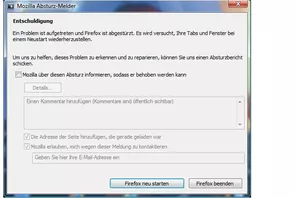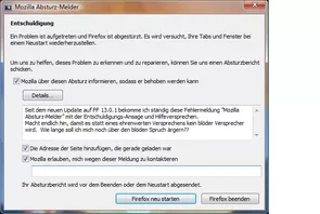 Seit dem Update auf FF 13 muss ich mich wieder aufregen. Ständig taucht da so unvermittelt beim Verlassen des internet so ein Fenster "Firefox Absturz Melder". Außer schönen Worten ereignet sich nichts, und wie ich das ständige auftauchen vermeiden kann, erfahre ich auch nicht, echt nervig das Spielchen.