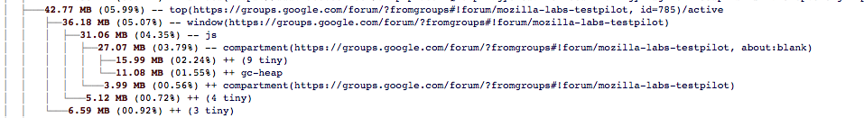öffne den mozilla-google-groups link in mind. 5 Tabs gleichzeitig und Dein Phys. Speicher geht auf 500MB!! bei 10Tabs auf 1GB und schlussendlich steht der Browser still auf Mactintosh !!! WTF (bei windows sind andere speicher-verhältnisse)